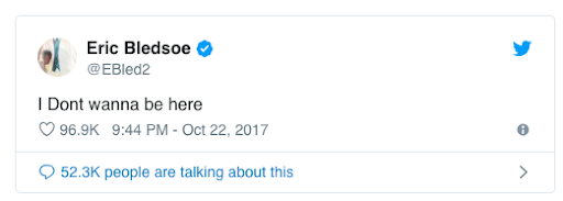 Début de saison 2017, Eric Bledsoe est dans un salon de coiffure et tweete “I don’t wanna be here”. Les rumeurs de trade enflent du côté de l’Arizona surtout que la franchise vient de se séparer de son coach après une reprise compliqué. Le meneur niera toutefois qu’il visait son équipe et précisera qu’il avait déjà fait une demande de transfert en interne avant la pré saison. Malgré tout Twitter s’enflamme et le joueur continue son petit jeu en postant des messages énigmatiques ou en retweetant des déclarations à son sujet tout en les commentant. Un peu de fun du côté de Phoenix mais moins pour l’image des Suns déjà mise à mal par des résultats catastrophiques. La NBA sanctionne Bledsoe par une amende de 10 000 $. Pour un tweet chez le coiffeur, ça fait cher la note !