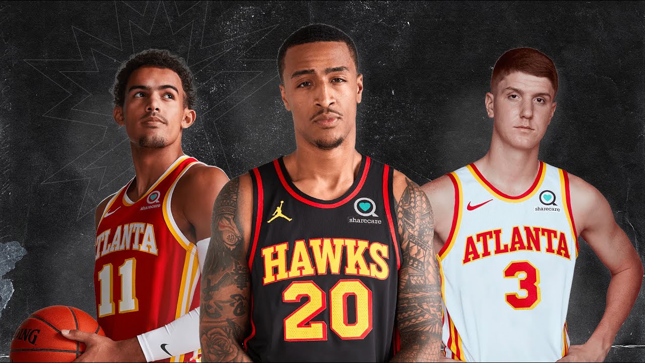 Les 3 nouveaux maillots des Hawks portés par Trae Young (rouge) Cam Reddish (noir) et John Collins (blanc)