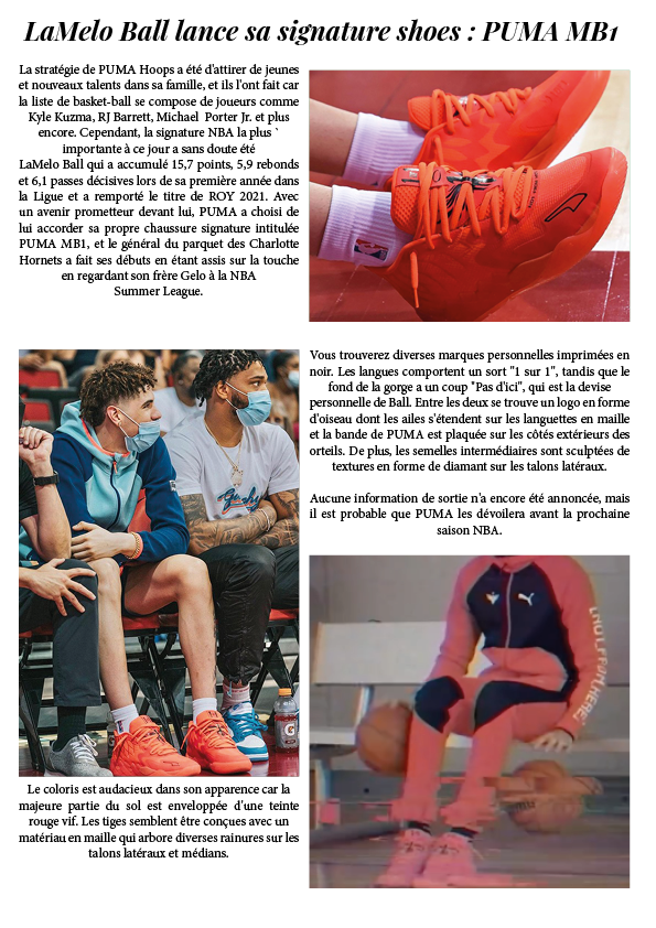 LaMelo Ball lance sa signature shoes : PUMA MB1 10 août 20219 août 2021 par dunkiin Partager : Cliquer pour partager sur X(ouvre dans une nouvelle fenêtre) X Cliquez pour partager sur Facebook(ouvre dans une nouvelle fenêtre) Facebook J’aime chargement… dunkiin Laisser un commentaire Annuler la réponse. Δ