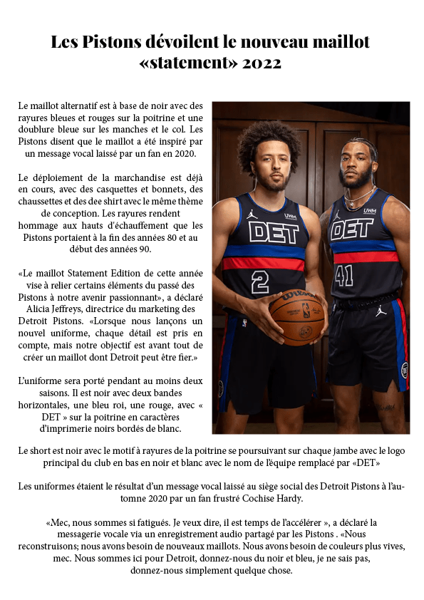 Les Pistons dévoilent le nouveau maillot « statement » 2022 8 septembre 202230 décembre 2022 par dunkiin 1/2/3/4 Partager : Cliquer pour partager sur X(ouvre dans une nouvelle fenêtre) X Cliquez pour partager sur Facebook(ouvre dans une nouvelle fenêtre) Facebook J’aime chargement… dunkiin Laisser un commentaire Annuler la réponse. Δ