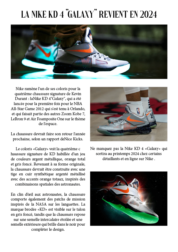 La Nike KD 4 « Galaxy » revient en 2024 7 Mai 20233 Mai 2023 par dunkiin Partager : Cliquer pour partager sur X(ouvre dans une nouvelle fenêtre) X Cliquez pour partager sur Facebook(ouvre dans une nouvelle fenêtre) Facebook J’aime chargement… dunkiin Laisser un commentaire Annuler la réponse. Δ