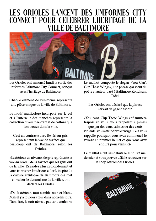 Les Orioles lancent des uniformes City Connect pour célébrer l’héritage de la ville de Baltimore 24 Mai 202328 juin 2023 par dunkiin 1/2/3/4/5 1/2/3/4 LE MAILLOT ICI OU ICI Partager : Cliquer pour partager sur X(ouvre dans une nouvelle fenêtre) X Cliquez pour partager sur Facebook(ouvre dans une nouvelle fenêtre) Facebook J’aime chargement… dunkiin Laisser un commentaire Annuler la réponse. Δ