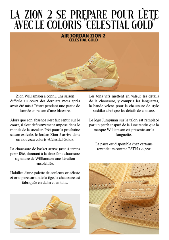 La Zion 2 se prépare pour l’été avec le coloris « Celestial Gold » 6 juillet 202330 Mai 2023 par dunkiin LA PAIRE ICI Partager : Cliquer pour partager sur X(ouvre dans une nouvelle fenêtre) X Cliquez pour partager sur Facebook(ouvre dans une nouvelle fenêtre) Facebook J’aime chargement… dunkiin Laisser un commentaire Annuler la réponse. Δ