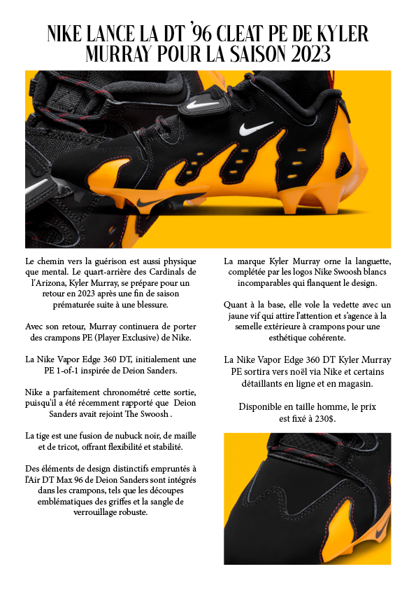 Nike lance la DT ’96 Cleat PE de Kyler Murray pour la saison 2023 5 septembre 20231 septembre 2023 par dunkiin Partager : Cliquer pour partager sur X(ouvre dans une nouvelle fenêtre) X Cliquez pour partager sur Facebook(ouvre dans une nouvelle fenêtre) Facebook J’aime chargement… dunkiin Laisser un commentaire Annuler la réponse. Δ