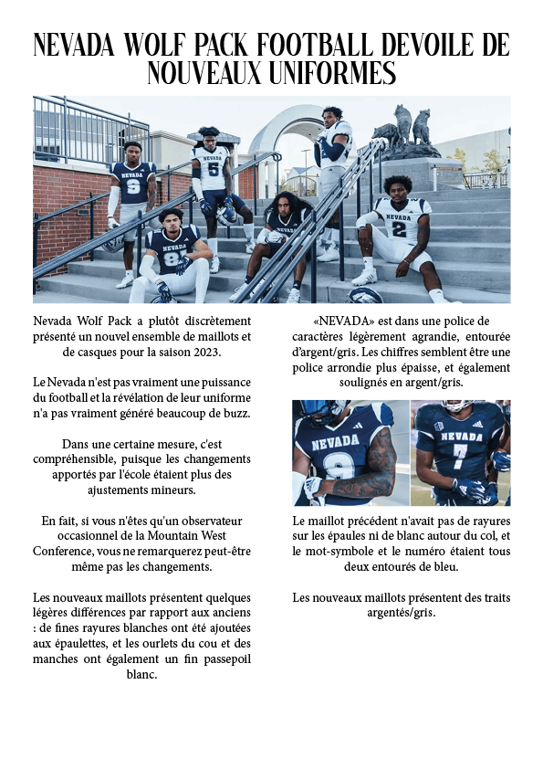 Nevada Wolf Pack Football dévoile de nouveaux uniformes 27 septembre 202310 août 2023 par dunkiin Partager : Cliquer pour partager sur X(ouvre dans une nouvelle fenêtre) X Cliquez pour partager sur Facebook(ouvre dans une nouvelle fenêtre) Facebook J’aime chargement… dunkiin Laisser un commentaire Annuler la réponse. Δ