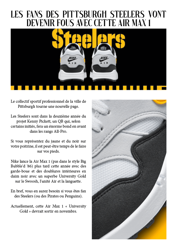 Les fans des Pittsburgh Steelers vont devenir fous avec cette Air Max 1 19 octobre 202323 août 2023 par dunkiin Partager : Cliquer pour partager sur X(ouvre dans une nouvelle fenêtre) X Cliquez pour partager sur Facebook(ouvre dans une nouvelle fenêtre) Facebook J’aime chargement… dunkiin Laisser un commentaire Annuler la réponse. Δ