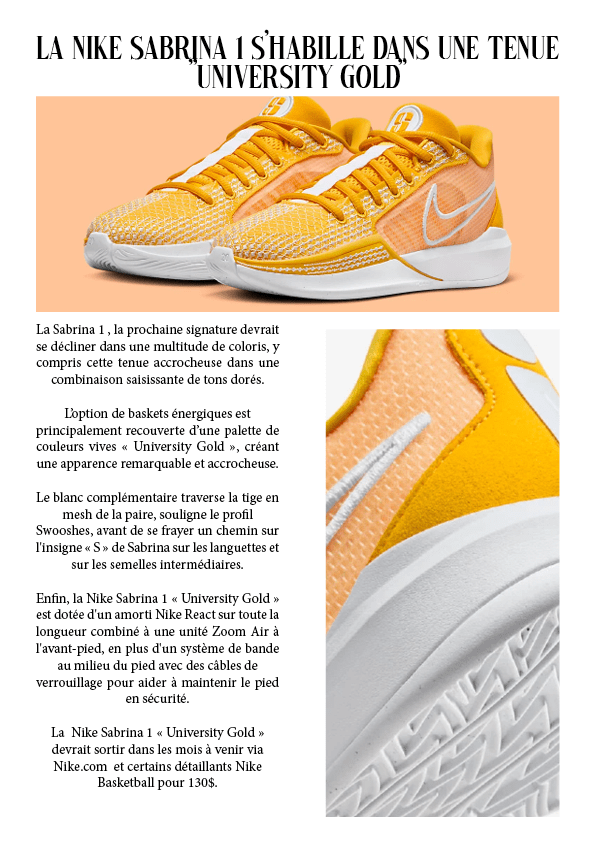 La Nike Sabrina 1 s’habille dans une tenue « University Gold » 22 octobre 20235 septembre 2023 par dunkiin Partager : Cliquer pour partager sur X(ouvre dans une nouvelle fenêtre) X Cliquez pour partager sur Facebook(ouvre dans une nouvelle fenêtre) Facebook J’aime chargement… dunkiin Laisser un commentaire Annuler la réponse. Δ