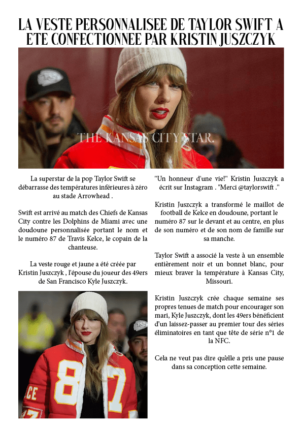 La veste personnalisée de Taylor Swift a été confectionnée par Kristin Juszczyk 15 janvier 202414 janvier 2024 par dunkiin View this post on Instagram A post shared by Kristin Juszczyk (@kristinjuszczyk) Le site internet de Kristin ici Partager : Cliquer pour partager sur X(ouvre dans une nouvelle fenêtre) X Cliquez pour partager sur Facebook(ouvre dans une nouvelle fenêtre) Facebook J’aime chargement… dunkiin Laisser un commentaire Annuler la réponse. Δ