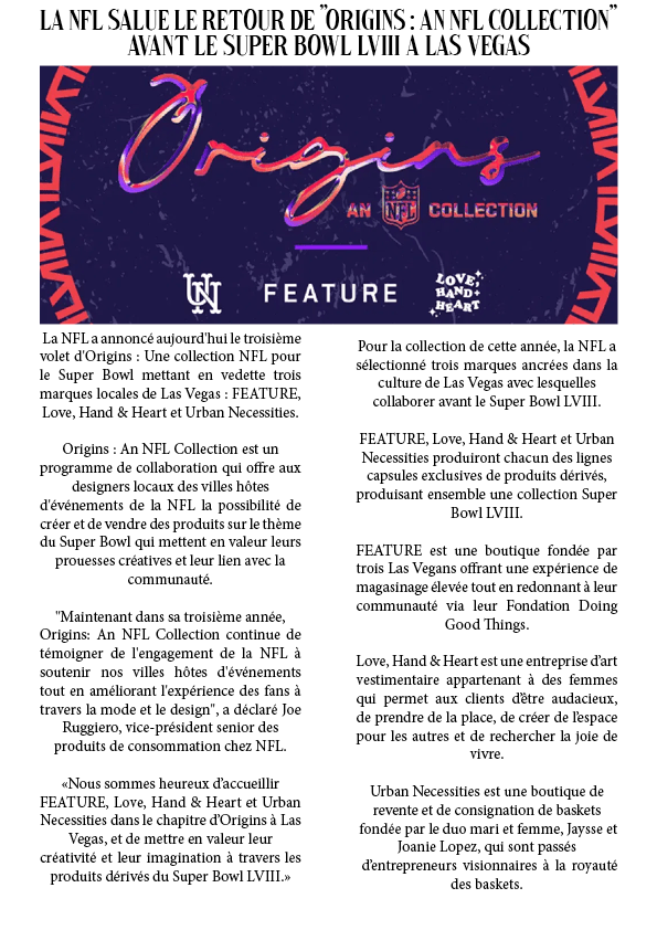 La NFL salue le retour de « Origins : An NFL Collection » avant le Super Bowl LVIII à Las Vegas 8 février 202425 janvier 2024 par dunkiin Partager : Cliquer pour partager sur X(ouvre dans une nouvelle fenêtre) X Cliquez pour partager sur Facebook(ouvre dans une nouvelle fenêtre) Facebook J’aime chargement… dunkiin Laisser un commentaire Annuler la réponse. Δ