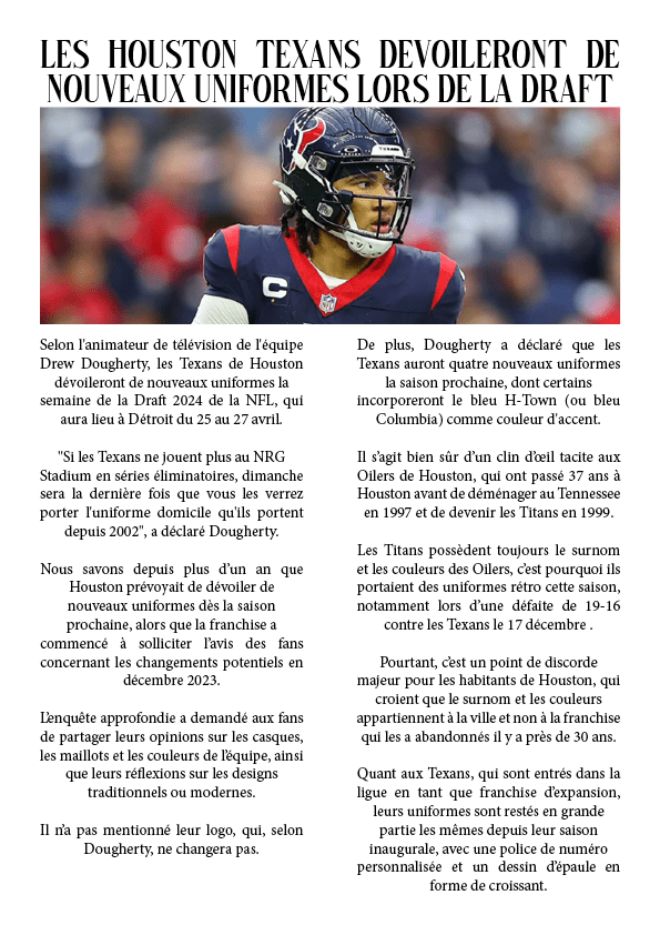 Les Houston Texans dévoileront de nouveaux uniformes lors de la Draft 16 février 20246 janvier 2024 par dunkiin Partager : Cliquer pour partager sur X(ouvre dans une nouvelle fenêtre) X Cliquez pour partager sur Facebook(ouvre dans une nouvelle fenêtre) Facebook J’aime chargement… dunkiin Laisser un commentaire Annuler la réponse. Δ