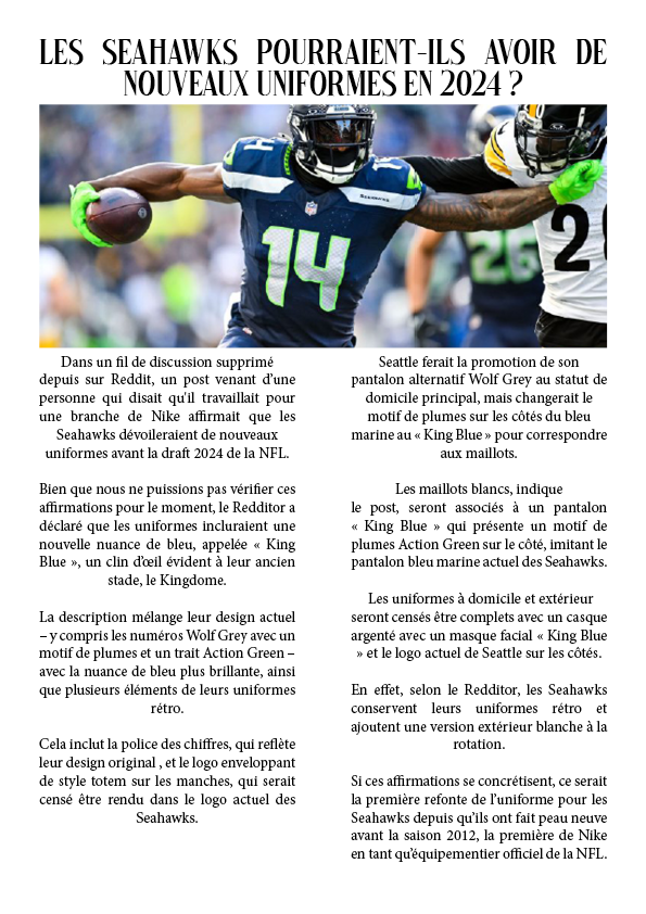 Les Seahawks pourraient-ils avoir de nouveaux uniformes en 2024 ? 25 février 202418 janvier 2024 par dunkiin Now-deleted Reddit post on /Seahawks indicating the Seahawks are getting new uniforms in 2024? pic.twitter.com/O9VoOJtk6z— Geno Smith is #Good (@ColdWunz) January 16, 2024 Partager : Cliquer pour partager sur X(ouvre dans une nouvelle fenêtre) X Cliquez pour partager sur Facebook(ouvre dans une nouvelle fenêtre) Facebook J’aime chargement… dunkiin Laisser un commentaire Annuler la réponse. Δ