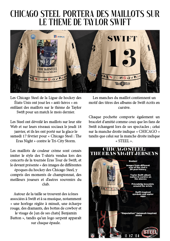 Chicago Steel portera des maillots sur le thème de Taylor Swift 17 mars 202430 janvier 2024 par dunkiin Partager : Cliquer pour partager sur X(ouvre dans une nouvelle fenêtre) X Cliquez pour partager sur Facebook(ouvre dans une nouvelle fenêtre) Facebook J’aime chargement… dunkiin Laisser un commentaire Annuler la réponse. Δ