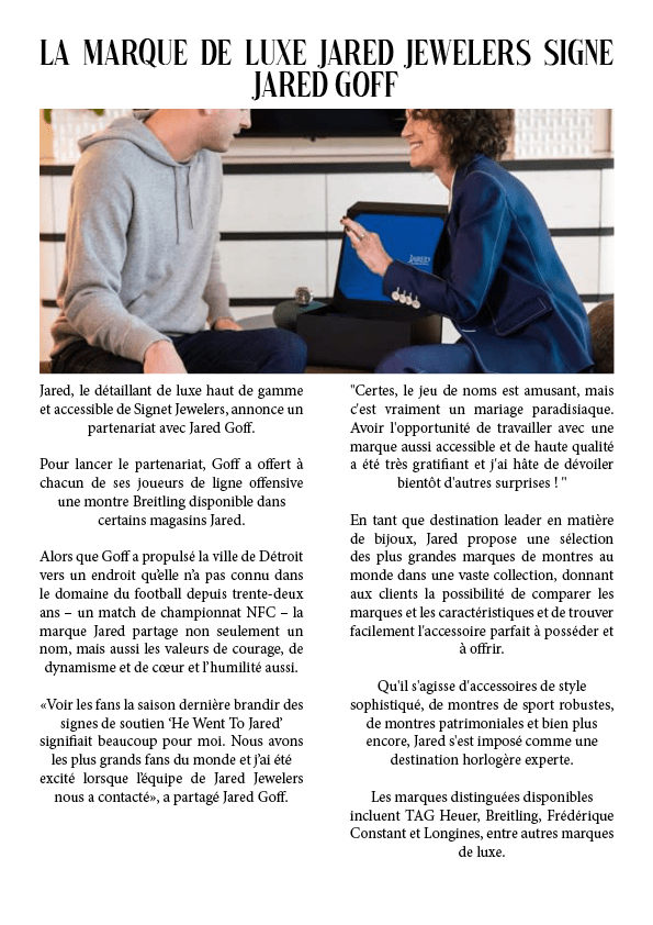La marque de luxe Jared Jewelers signe Jared Goff 27 mars 202428 février 2024 par dunkiin Partager : Cliquer pour partager sur X(ouvre dans une nouvelle fenêtre) X Cliquez pour partager sur Facebook(ouvre dans une nouvelle fenêtre) Facebook J’aime chargement… dunkiin Laisser un commentaire Annuler la réponse. Δ