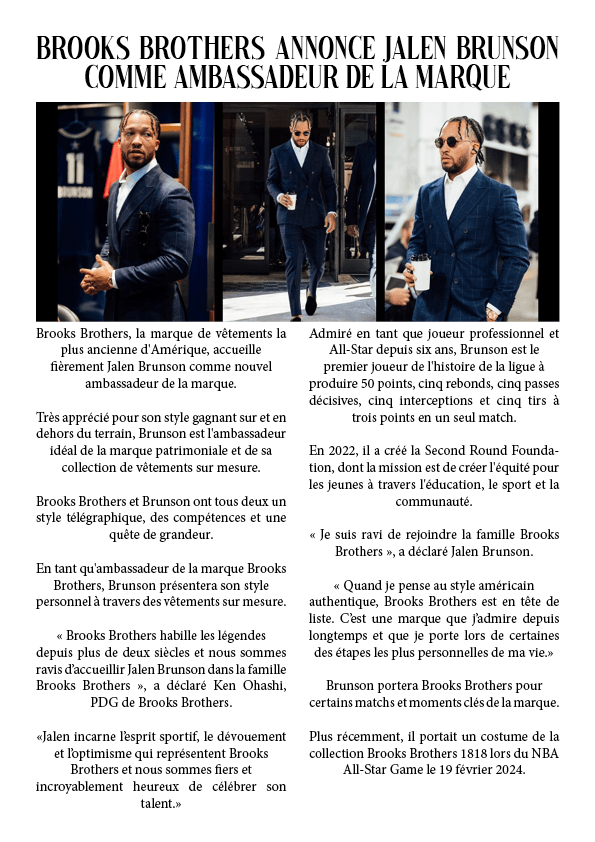 Brooks Brothers annonce Jalen Brunson comme ambassadeur de la marque 17 avril 202412 mars 2024 par dunkiin Partager : Cliquer pour partager sur X(ouvre dans une nouvelle fenêtre) X Cliquez pour partager sur Facebook(ouvre dans une nouvelle fenêtre) Facebook J’aime chargement… dunkiin Laisser un commentaire Annuler la réponse. Δ