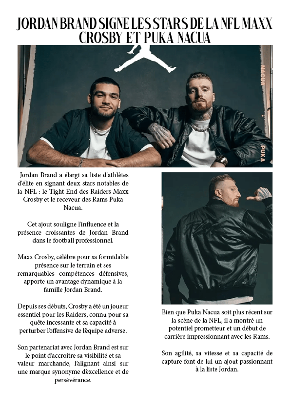 Jordan Brand signe les stars de la NFL Maxx Crosby et Puka Nacua 8 Mai 20247 Mai 2024 par dunkiin Partager : Cliquer pour partager sur X(ouvre dans une nouvelle fenêtre) X Cliquez pour partager sur Facebook(ouvre dans une nouvelle fenêtre) Facebook J’aime chargement… dunkiin Laisser un commentaire Annuler la réponse. Δ