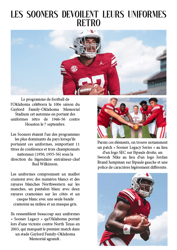 Les Sooners dévoilent leurs uniformes rétro 6 septembre 202427 août 2024 par dunkiin Partager : Cliquer pour partager sur X(ouvre dans une nouvelle fenêtre) X Cliquez pour partager sur Facebook(ouvre dans une nouvelle fenêtre) Facebook J’aime chargement… dunkiin Laisser un commentaire Annuler la réponse. Δ
