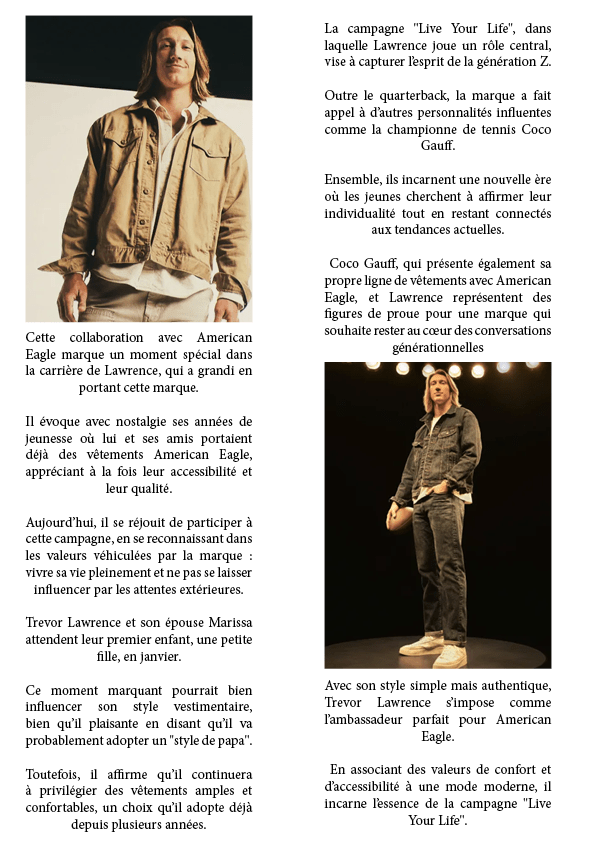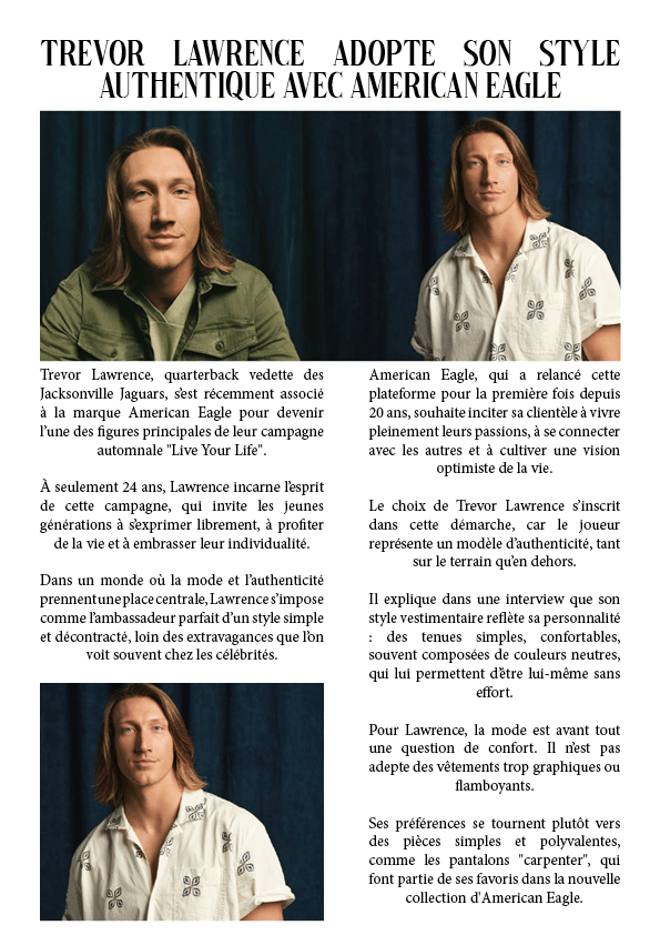 Trevor Lawrence adopte son style authentique avec American Eagle 22 septembre 202422 septembre 2024 par dunkiin Partager : Cliquer pour partager sur X(ouvre dans une nouvelle fenêtre) X Cliquez pour partager sur Facebook(ouvre dans une nouvelle fenêtre) Facebook J’aime chargement… dunkiin Laisser un commentaire Annuler la réponse. Δ