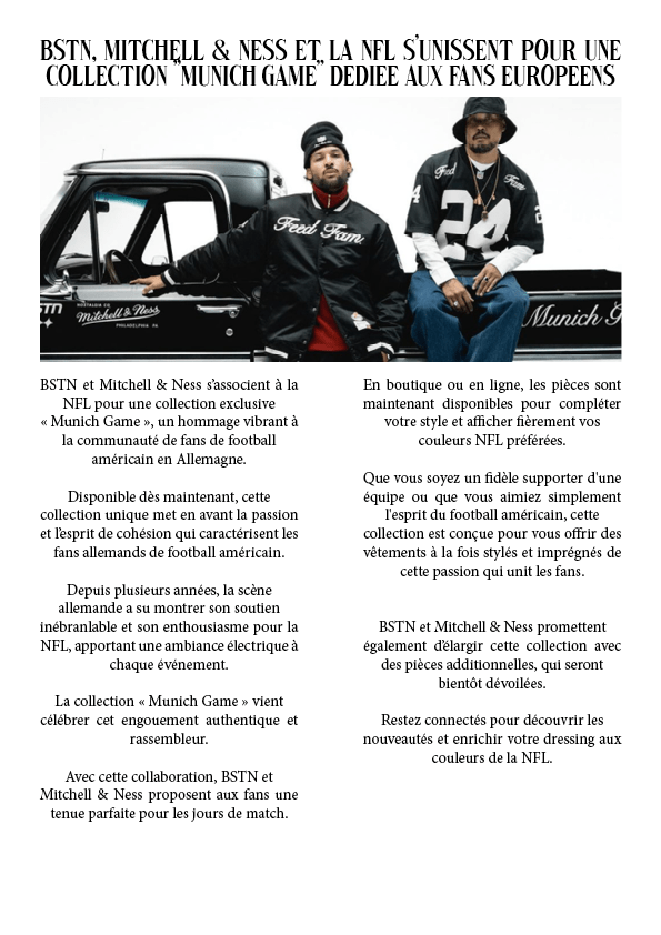 BSTN, Mitchell & Ness et la NFL s’unissent pour une collection « Munich Game » dédiée aux fans européens 1 novembre 202416 novembre 2024 par dunkiin LA COLLECTION ICI Partager : Cliquer pour partager sur X(ouvre dans une nouvelle fenêtre) X Cliquez pour partager sur Facebook(ouvre dans une nouvelle fenêtre) Facebook J’aime chargement… dunkiin Laisser un commentaire Annuler la réponse. Δ