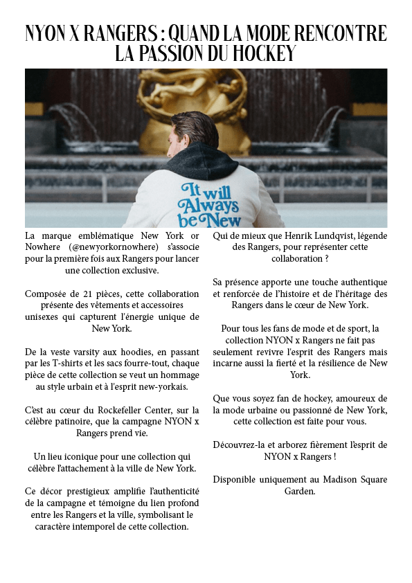 NYON x Rangers : Quand la mode rencontre la passion du hockey 14 novembre 202413 novembre 2024 par dunkiin Partager : Cliquer pour partager sur X(ouvre dans une nouvelle fenêtre) X Cliquez pour partager sur Facebook(ouvre dans une nouvelle fenêtre) Facebook J’aime chargement… dunkiin Laisser un commentaire Annuler la réponse. Δ