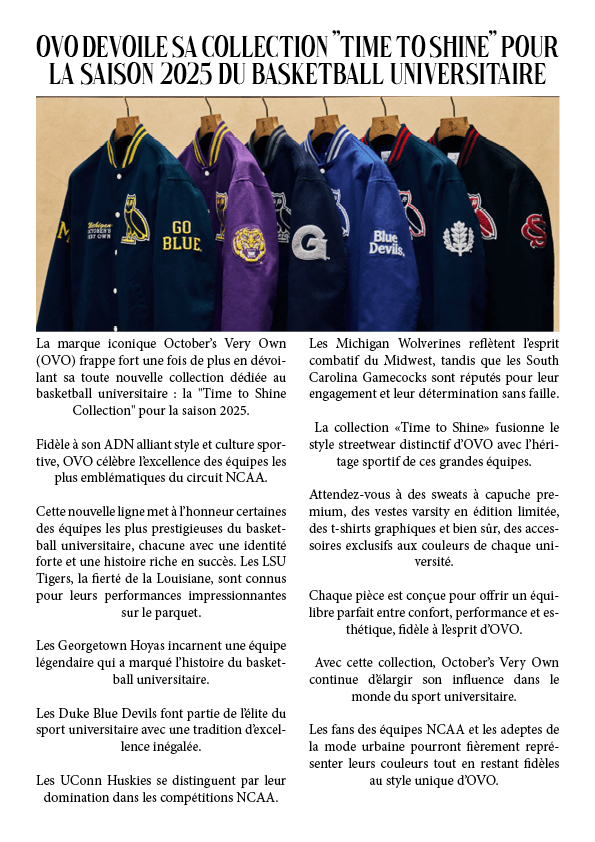OVO dévoile sa collection « Time to Shine » pour la saison 2025 du Basketball Universitaire 8 mars 202529 mars 2025 par dunkiin LA COLLECTION ICI Partager : Cliquer pour partager sur X(ouvre dans une nouvelle fenêtre) X Cliquez pour partager sur Facebook(ouvre dans une nouvelle fenêtre) Facebook J’aime chargement… dunkiin Laisser un commentaire Annuler la réponse. Δ