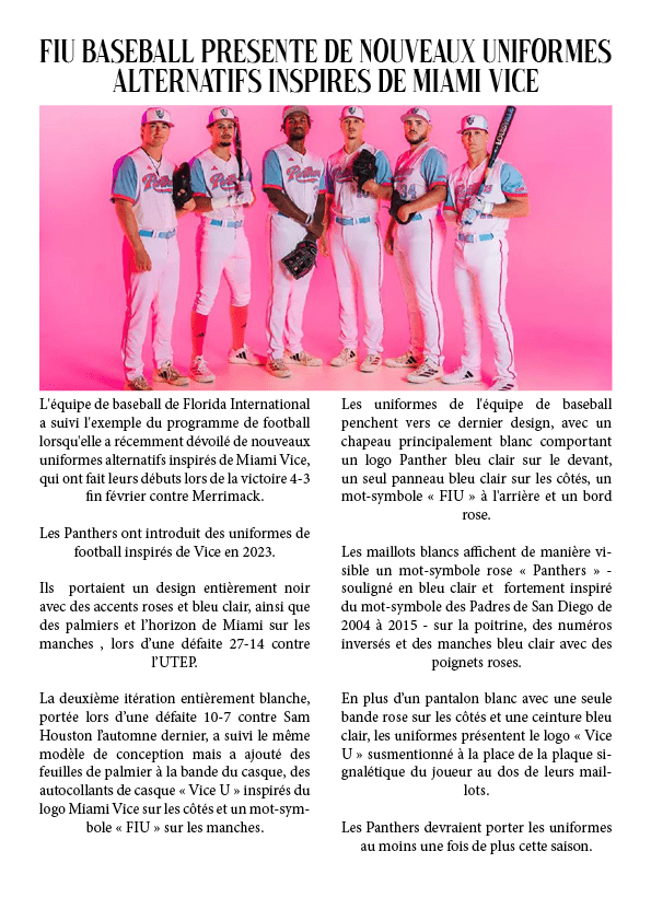 FIU Baseball présente de nouveaux uniformes alternatifs inspirés de Miami Vice 23 avril 20254 mars 2025 par dunkiin Partager : Cliquer pour partager sur X(ouvre dans une nouvelle fenêtre) X Cliquez pour partager sur Facebook(ouvre dans une nouvelle fenêtre) Facebook J’aime chargement… dunkiin Laisser un commentaire Annuler la réponse. Δ