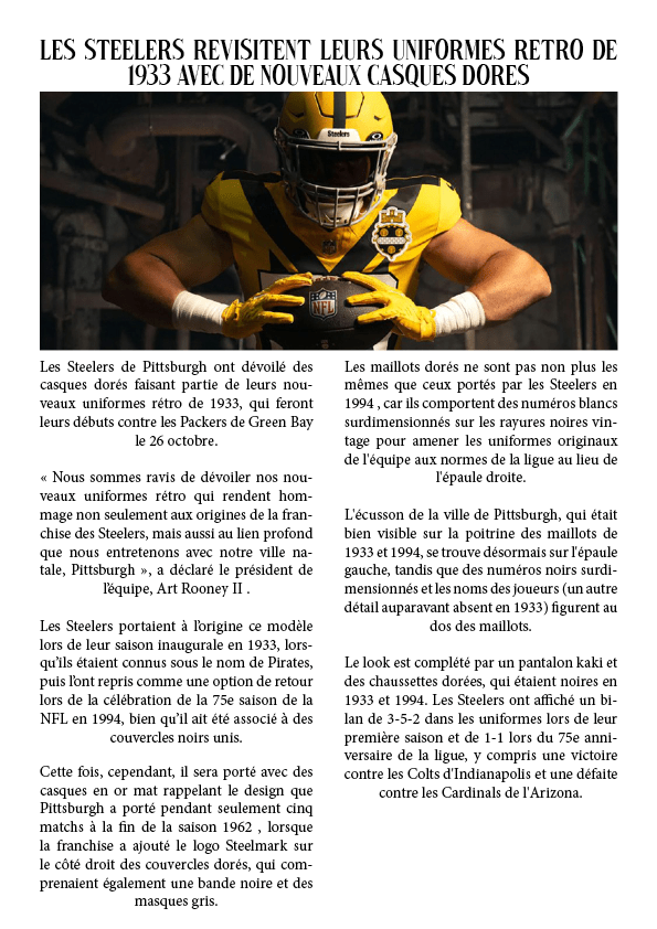 Les Steelers revisitent leurs uniformes rétro de 1933 avec de nouveaux casques dorés 6 août 20256 août 2025 par dunkiin LE MAILLOT ICI Partager : Cliquer pour partager sur X(ouvre dans une nouvelle fenêtre) X Cliquez pour partager sur Facebook(ouvre dans une nouvelle fenêtre) Facebook J’aime chargement… dunkiin Laisser un commentaire Annuler la réponse. Δ