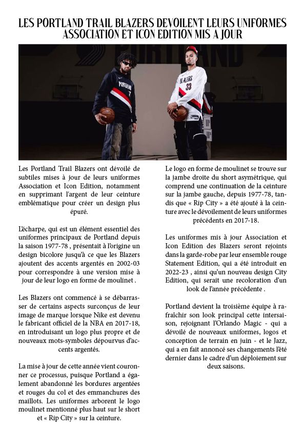 Les Portland Trail Blazers dévoilent leurs uniformes Association et Icon Edition mis à jour 11 août 202511 août 2025 par dunkiin Partager : Cliquer pour partager sur X(ouvre dans une nouvelle fenêtre) X Cliquez pour partager sur Facebook(ouvre dans une nouvelle fenêtre) Facebook J’aime chargement… dunkiin Laisser un commentaire Annuler la réponse. Δ