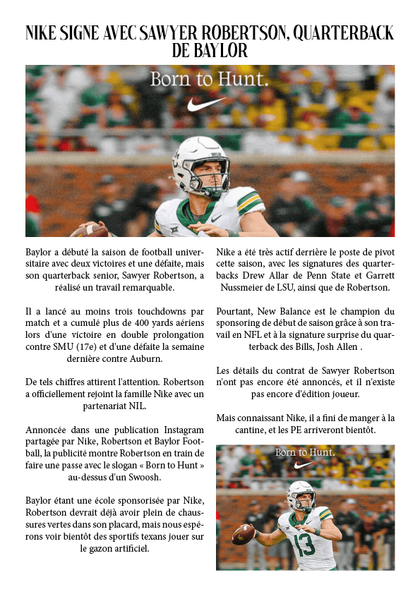 Nike signe avec Sawyer Robertson, quarterback de Baylor 2 octobre 20251 octobre 2025 par dunkiin Partager : Cliquer pour partager sur X(ouvre dans une nouvelle fenêtre) X Cliquez pour partager sur Facebook(ouvre dans une nouvelle fenêtre) Facebook J’aime chargement… dunkiin Laisser un commentaire Annuler la réponse. Δ